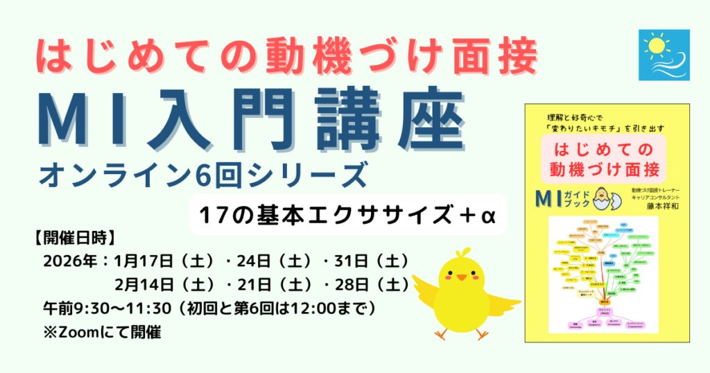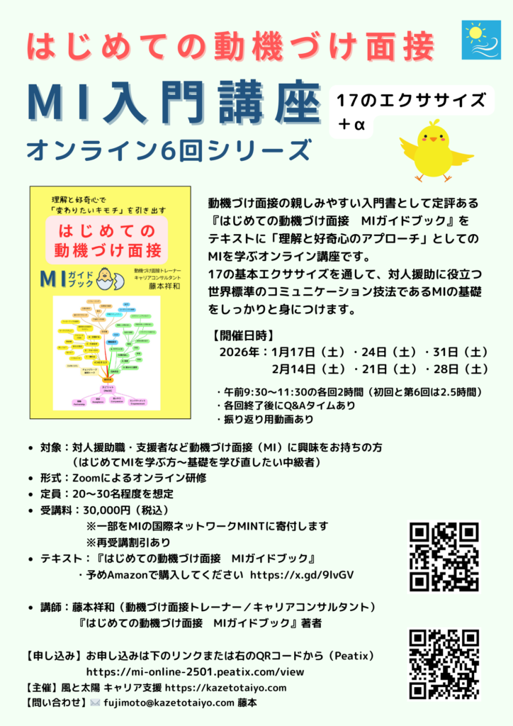 ※はじめての動機づけ面接 MI入門講座オンライン(2026年1月〜2月/6回シリーズ)Peatix案内&申し込みページ