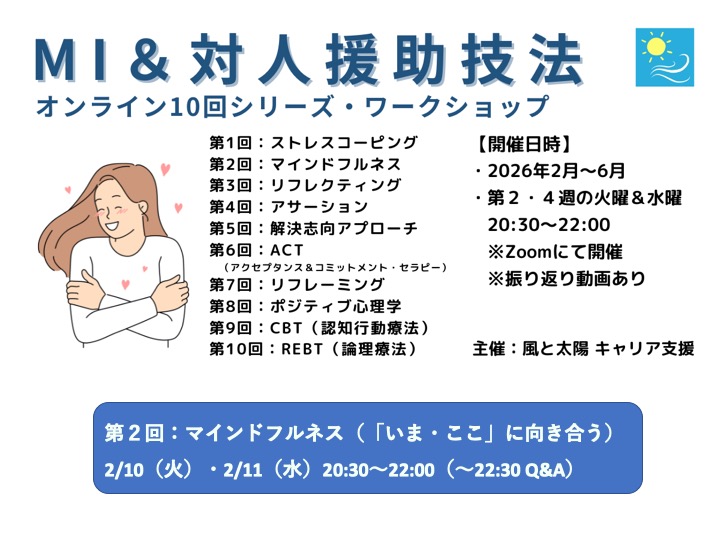 MI&対人援助技法のワークショップ・シリーズ、私自身も参加者の皆さんと学びながら少しずつ進めています。